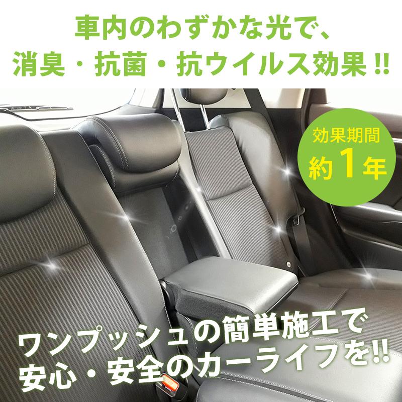 わずかな光でもウイルスや細菌、臭いのもとや有害物質までも分解する光触媒で継続的な効果が期待できます。 飲食や、たばこなど、車内の気になる臭い(の成分)や、そして細菌類を光の力で 二酸化炭素と水に分解します。 除菌効果 食中毒を招く黄色ブドウ球菌、o157の原因となる腸管